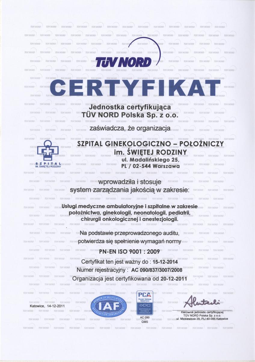 Uzyskanie certyfikatu jest wynikiem poddania się  auditowi recertyfikacyjnemu, który został przeprowadzony w dniach  08-09.12.2011 przez auditorów akredytowanej,  międzynarodowej jednostki certyfikacyjnej TUV - NORD.Otrzymany certyfikat potwierdza wysoką jakość świadczonych usług ambulatoryjnych i szpitalnych w naszej placówce w zakresie: położnictwa, ginekologii, neonatologii, pediatrii, chirurgii onkologicznej i anestezjologii