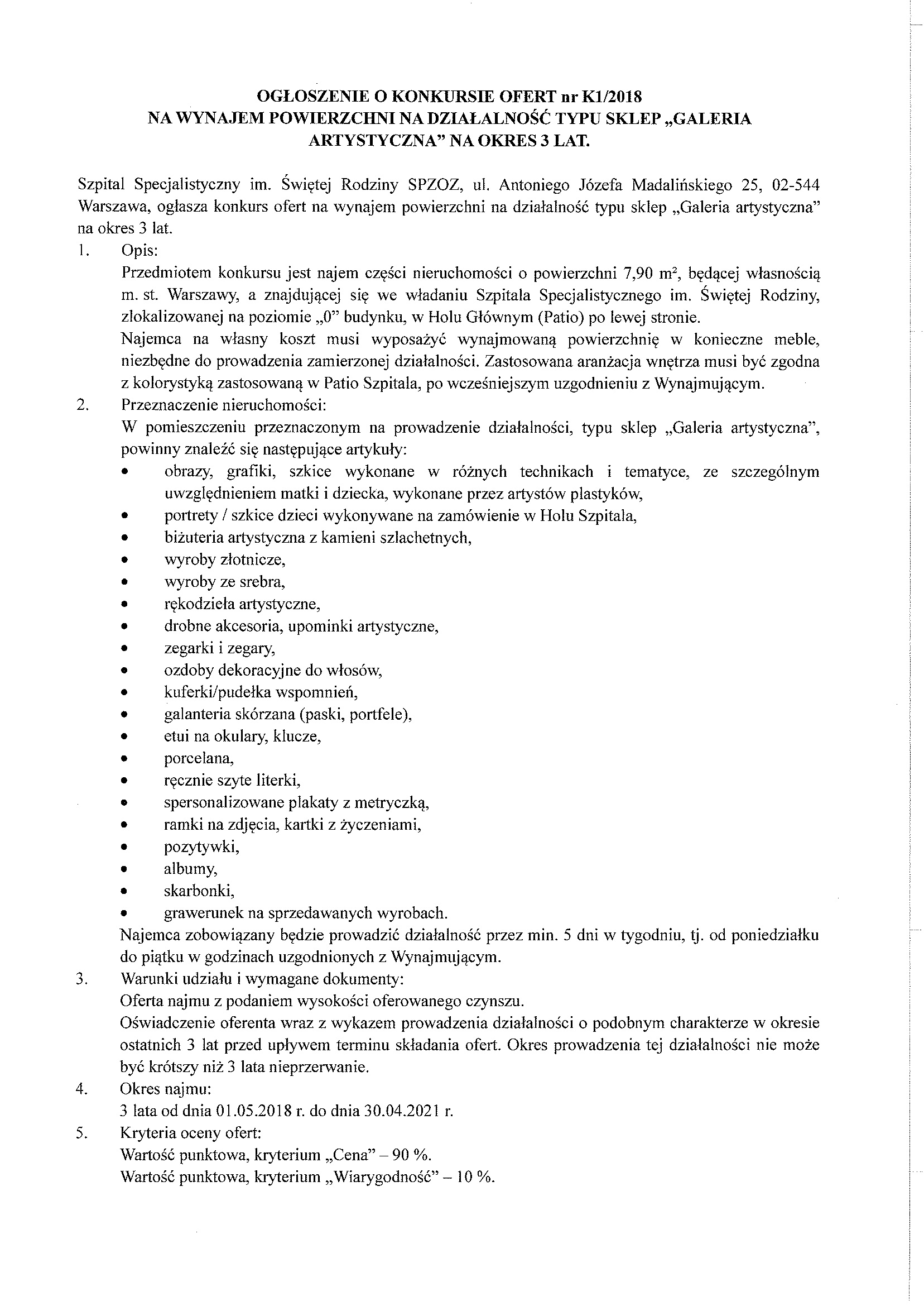 K1/2018 Konkurs ofert na wynajem powierzchni na działalność typu sklep "Galeria Artystyczna" na okres 3 lat